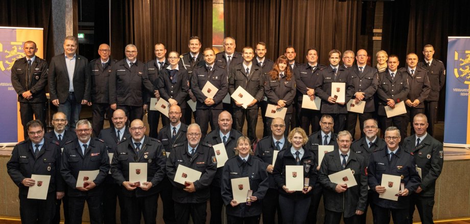BU: Für die Sicherheit der Bürgerinnen und Bürger im Einsatz: In den Freiwilligen Feuerwehren der Verbandsgemeinde Rennerod wurden 34 Feuerwehrkameradinnen und -kameraden für ihren aktiven, pflichttreuen Feuerwehrdienst ausgezeichnet.