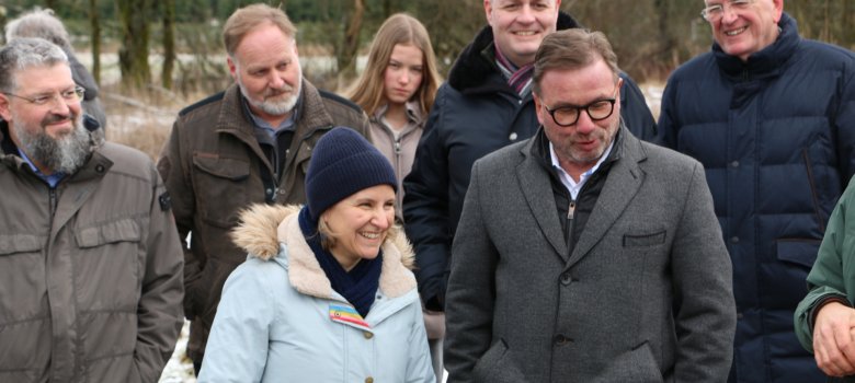 Die Bereitschaft der Ortsgemeinden griff Umweltministerin Katrin Eder lobend in ihrer anschließenden Rede auf und betonte, dass Natur- und Artenschutz nur in enger Abstimmung mit den Menschen vor Ort möglich ist und sie sich wünscht, dass auch weitere lokale Akteurinnen und Akteure und Gemeinden dem Beispiel der bereits involvierten Ortsgemeinden folgen. „Neben den so wichtigen Maßnahmen zur Lebensraumverbesserung des Blauschillernden Feuerfalters bietet das noch junge Projekt eine gute Chance ein Praxisbeispiel dafür zu werden, wie sich Arten- und Lebensraumschutz auch positiv auf den Hochwasserschutz auswirken können. Denn die anvisierten Maßnahmen zur Wiedervernässung, die den schwindenden Lebensraum des Blauschillernden Feuerfalters verbessern sollen, können zugleich einen wichtigen Beitrag zum Wasserrückhalt in der Fläche und somit zum Hochwasserschutz beitragen“ so die Ministerin. Die 1,8 Millionen Euro stammen aus Ersatzzahlungen aus der naturschutzrechtlichen Eingriffsregelung, die die Stiftung Natur und Umwelt im Auftrag der Landesregierung verwaltet. Das Projekt hat eine Laufzeit von 15 Jahren.