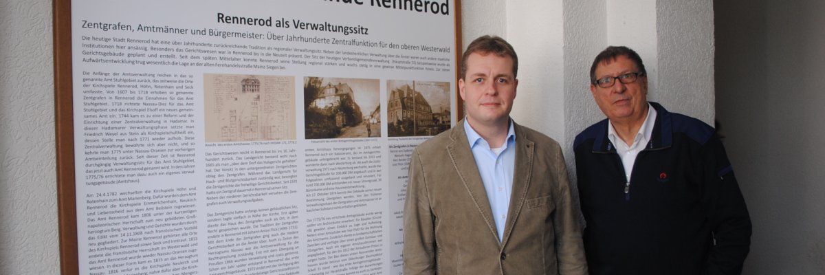 ■ Rennerod. Im Gebäude der Verbandsgemeinde in Rennerod verdeutlicht eine Tafel die lange Verwaltungstradition des alten und neuen Amtssitzes Rennerod. Im Beisein von VG-Bürgermeister Gerrit Müller und dem Verfasser Wolfgang Gerz (Oberrod) wurde diese Infotafel jetzt offiziell ihrer Bestimmung übergeben. Sie informiert über die Jahrhunderte zurückreichende Tradition der heutigen Stadt als zentraler Verwaltungssitz im Hohen Westerwald. Gerrit Müller zeigte sich erfreut, dass nunmehr im Gebäude selbst eine Rückschau auf die Geschichte des Hauses möglich ist: „Jüngere Bewohner oder auch viele Besucher wissen ja nicht mehr, dass hier über Jahrzehnte ein Amtsgericht seinen Sitz hatte“ Bei Verlegung des Amtsgerichtes nach Westerburg ging das Gebäude an die neu gegründete Verbandsgemeinde über, die damit ein markantes Baudenkmal in der Mitte der Stadt einer sinnvollen Nutzung zuführte und so langfristig den Erhalt sicherte. Wolfgang Gerz freute sich besonders über einen Fund im Hauptstaatsarchiv in Wiesbaden: „In einer Bauakte aus dem Jahr 1775 hatte sich sogar noch eine Zeichnung des ersten Amtshauses in Rennerod erhalten“.