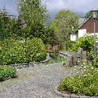 Das blaue Band kennzeichnet den Roßbach, die Säulen dokumentieren den früher bedeutenden Abbau von Säulenbasalt.